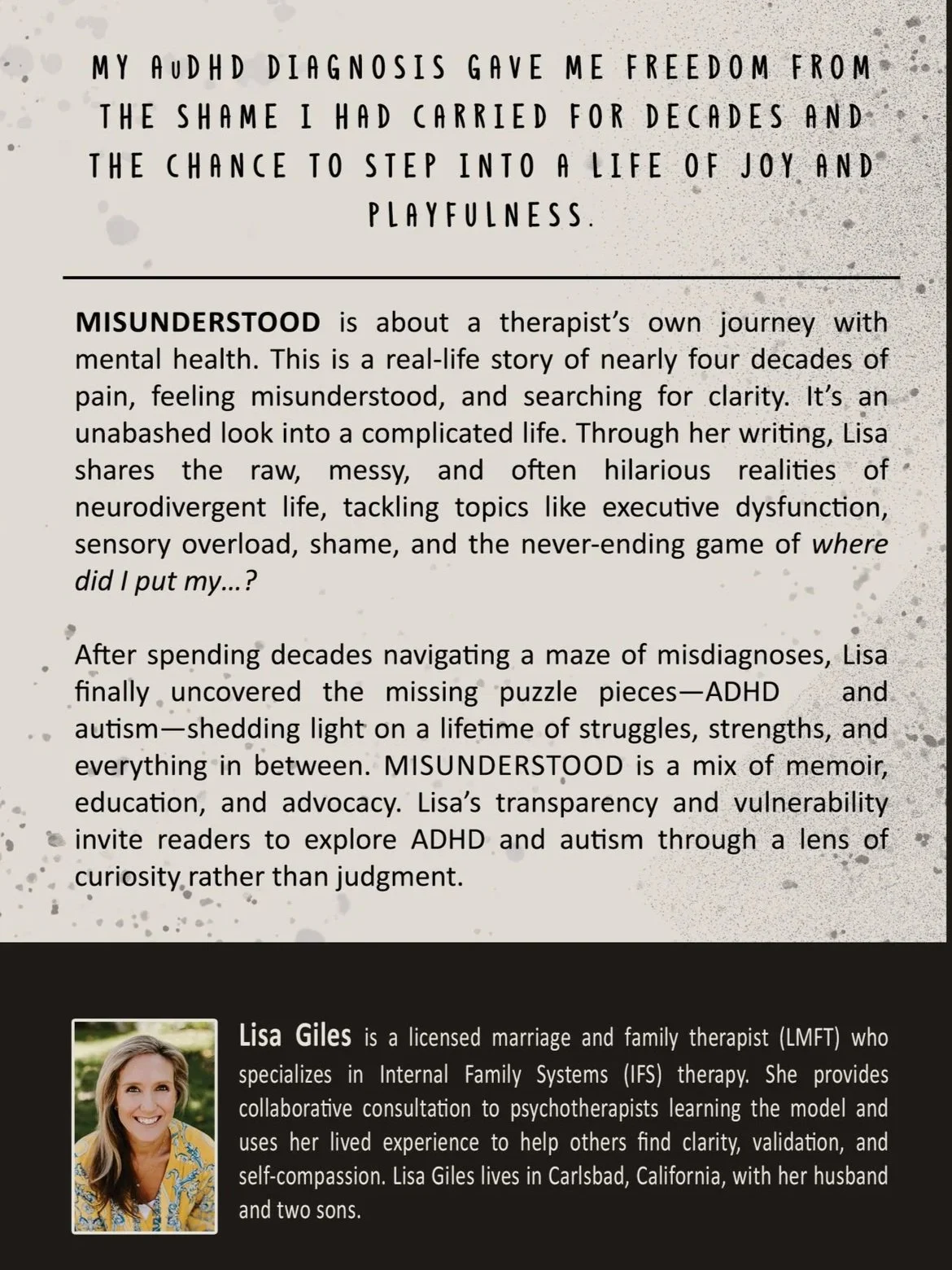 My Book My Book Misunderstood: My Journey to a Diagnosis of AuDHD That Explains Nearly Everything $24.99 Purchase Added! Have Questions?Lisagiles32@gmail.com(616)552-35717030 Snapdragon Dr.Carlsbad, CA 92011 Name * First Name Last Name Email * Thank you!